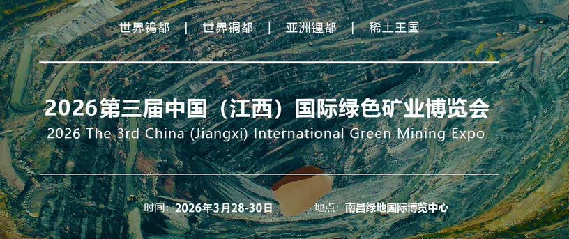 为了助力江西新时期矿山行业健康持续发展,加快推动新产品、新技术、新装备广泛应用。2026第三届中国(江西)国际绿色矿业博览会,将于2026年3月28-30日在南昌绿地国际博览中心举行。届时邀请政府领导、专家学者、企业高管、协会领导等一道解析行业发展形势,挖掘新动能,探寻发展思路,共同打造“创新、合作、发展、共赢”的全球矿业合作平台。
