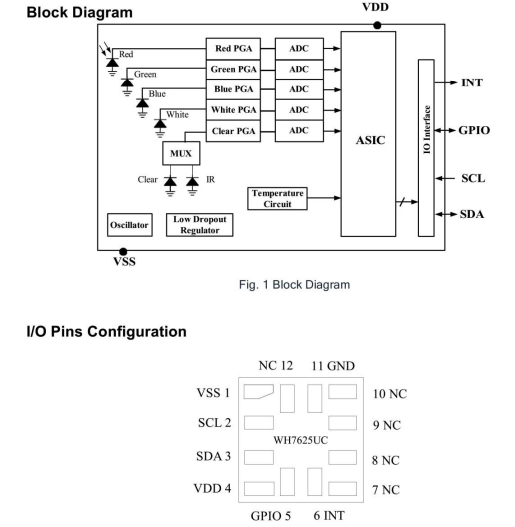 WH7625UC是一款数字输出的6通道(R, G, B, W, Clear, IR)环境光传感器,具备精确的环境光感知与颜色识别能力,集成了强大的闪烁检测引擎,能准确识别50Hz至1kHz 范围内的光源闪烁(如 50Hz/60Hz 的荧光灯、LED 灯频闪)精准的色彩感知,能感应测量红、绿、蓝、白、透明光和红外光的强度,为需要精密光传感的应用提供了灵活的解决方案。