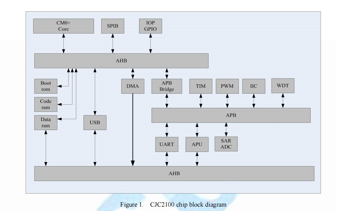 CJC2100芯片集成了2个AHB总线和1个APB(与AMBA协议兼容)。CPU核心在一个AHB总线中作为AHB主操作,DMA控制器在其他AHB总线上作为AHB主操作。一个AHB2APB桥用于外设配置。