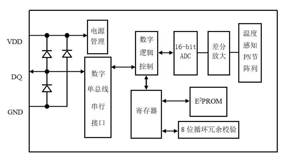 温度芯片内置16-bit ADC,分辨率0.004°C,具有-103°C到+153°C的超宽工作范围。芯片在出厂前经过100%的测试校准,根据温度误差特性进行校准系数的拟合,芯片内部自动进行补偿计算。为了简化系统应用,芯片的ID搜索、测温数据内存访问、功能配置等均基于数字单总线协议(One Wire,OW)指令,上位机微处理器只需要一个GPIO端口便可进行读写访问。单总线通信接口是通过共用一根数据总线来实现多节点传感采集与组网的低成本方案,传输距离远、支持节点数多,便于空间分布式传感组网。较多可支持100个节点100至500 米长的测温节点串联组网。