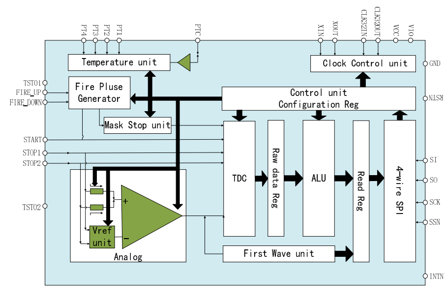 时间测量:芯片内置计时模块,从发射信号开始计时,直到接收器接收到反射波后停止计时,时间差乘以声速(通常取340m/s)即得距离。