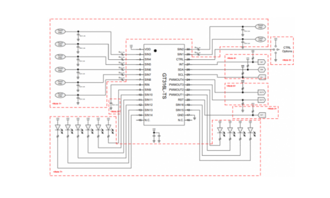 GT316L触摸芯片采用先进的算法能有效抑制水渍、水雾、潮湿甚至悬浮水滴带来的影响亦能在水中进行操作;支持更厚的面板材质和更灵敏的触发,即使戴着手套也能实现精准操作,待机模式功耗低至9.6μA(@3.3V)支持32级LED调光控制,可满足较多16键滑条和矩阵的设计需求。