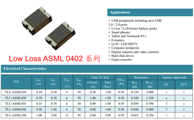 ASML0402产品系列型号有:TLC-ASML010、TLC-ASML020、TLC-ASML035、TLC-ASML050、TLC-ASML100,其保持电流:0.1A至1.0A,电阻:0.025~2.0Ω,跳闸电流(Itrip):0.3A至2.0A,最大电压(Vmax):6V至9V。
