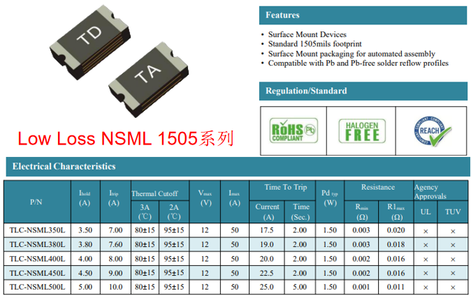 TLC推出0402封装、1505封装的新型超低电阻自恢复保险丝产品系列,具备国内行业领先的自恢复过流保护技术,产品通过UL、C-UL、TUV认证,符合RoHS、Reach、HF标准;具有超小封装、超低内阻、快速跳闸特点,不仅适用于锂电池、可穿戴智能设备狭窄空间的电路设计,也有效解决非常棘手的电路压降与电流损耗问题。