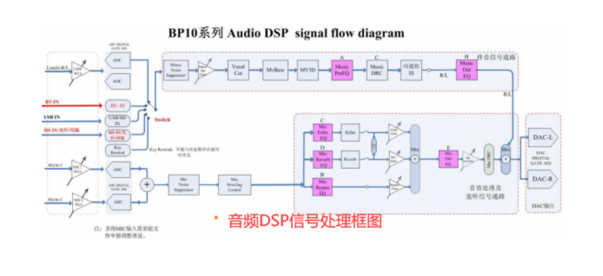 BP1048B2支持丰富的音频算法,音效包括回声、混音、3D环绕、虚拟低音、支持电音/变调/变声;同时还具备参数均衡器(EQ)动态范围压缩(DRC)回声消除(AEC)噪声抑制、移频(防啸叫)、啸叫侦测及抑制等特性;这些功能使其在蓝牙音频处理领域中能提供强大解决方案。