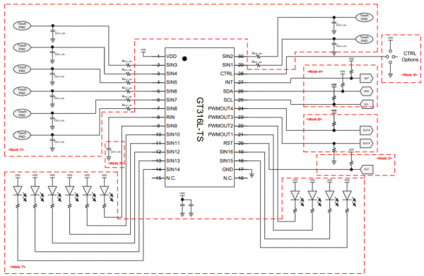 GT316L是一款高性能、低功耗的电容式触摸检测芯片;支持多达16个触摸通道,提供按键、滑条、滑轮等多种工作模式,内部集成高性能的(MCU)微控制器内核,采用先进的电容感应算法,能够通过检测人体手指触摸所带来的微小电容变化,实现精准的触摸识别。