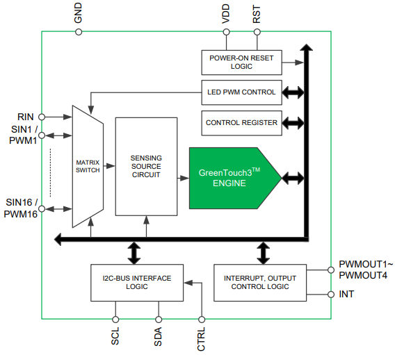 双功能引脚:SIN1~SIN16 引脚可配置为触摸输入或LED PWM输出。
