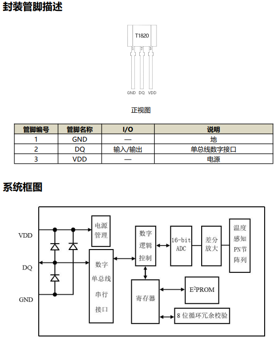 T1820温度传感芯片在 -10°C 至 +85°C的宽温度范围内,可实现±0.1°C 典型精度,即使在 -40°C 至 +125°C 的极端全温度范围内,其最大误差也严格控制在 ±0.5°C 以内,该系列支持单总线(One-Wire)通信协议,仅需一根数据线即可完成供电、寻址、测温与配置,极大简化了系统布线。单总线支持多节点串联组网,在5V电压与1K上拉电阻条件下,最多可连接100个节点,总缆长可达500米,非常适合分布式温度监测系统。