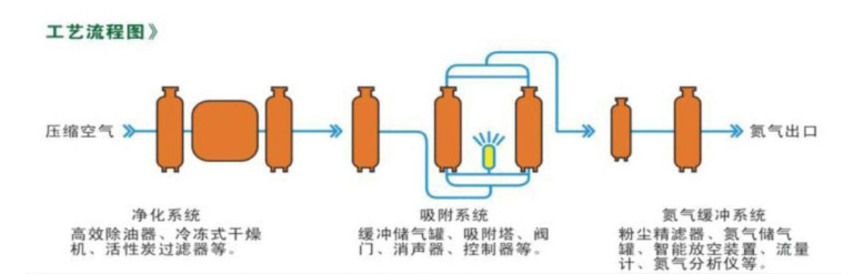 分子筛空分制氮也叫PSA或变压吸附式,以空气为原料,以碳分子筛作为吸附剂,运用变压吸附原理,利用碳分子筛对氧和氮的选择性吸附而使氮和氧分离的方法,通称PSA制氮。此法是七十年代迅速发展起来的一种新的制氮技术。与传统制氮法相比,它具有工艺流程简单、自动化程度高、产气快(15~30分钟)、能耗低,产品纯度可在较大范围内根据用户需要进行调节,操作维护方便、运行成本较低、装置适应性较强等特点,故在3000Nm³/h以下制氮设备中颇具竞争力,越来越得到中、小型氮气用户的欢迎,PSA制氮已成为中、小型氮气用户的首选方法。