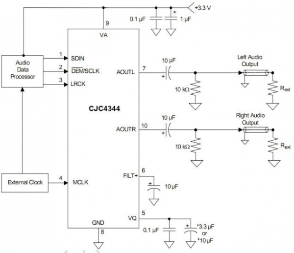 CJC4344不仅仅是一个DAC,更是一个 “即插即用”的完整音频输出系统,内部集成了数字插值滤波器、多比特ΔΣ调制器、开关电容DAC以及模拟输出滤波器,其灵活的时钟系统支持 自动检测模式,能够智能识别主时钟(MCLK)与左右时钟(LRCK)之间的多种比率(从64x到1152x)轻松兼容32kHz至192kHz采样率。