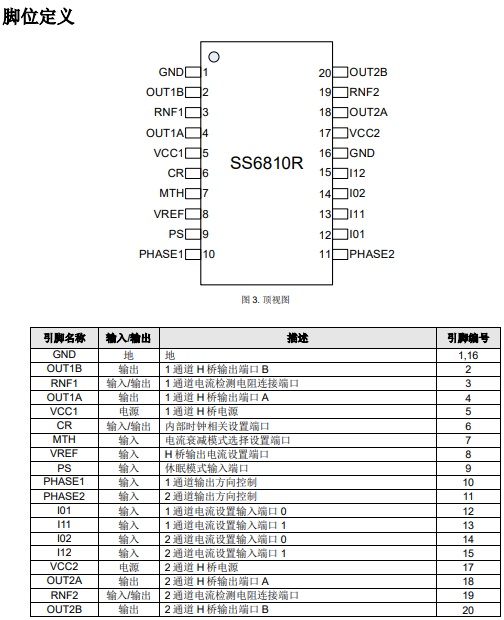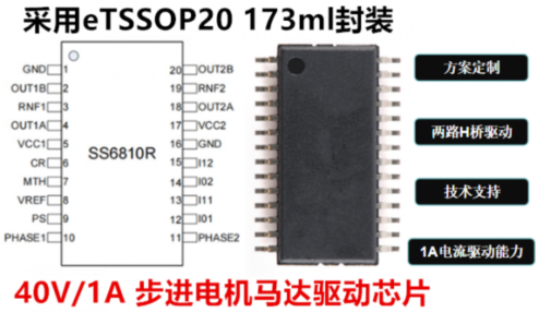 传统电机驱动方案常面临“低噪音 vs 快速响应”的两难:追求平滑会牺牲速度,追求速度又会增加噪声,SS6810R通过“快慢混合衰减模式”打破这一僵局,实现了精准的动态性能调节;此外其封装为eTSSOP20(173mil)具有良好的散热性能,符合Rohs规范,引脚框架100%无铅,适用于环保型电子产品设计。