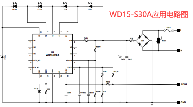 WD15-S30A兼容模拟调光功能,通过ADIM引脚输入电压实现亮度精准控制,提供4路LED驱动输出(D1~D4)各通道最大驱动电流分别为100mA(D1)、160mA(D2)、200mA(D3)、220mA(D4),可通过RCS引脚精准设定各段电流,满足不同亮度梯度需求,其功率因数(>0.9)和总谐波失真(<15%)能有效降低电能损耗,同时减少对电网的干扰。