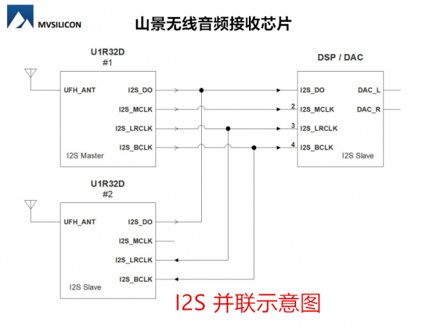 支持I2S音频接口,具备主从模式,支持多芯片并联输出,便于扩展多路音频系统。