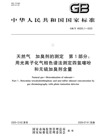 国家最新标准《GB/T 46550.1-2025 天然气 加臭剂的测定 第1部分:用光离子化气相色谱法测定四氢噻吩和无硫加臭剂含量》是由国家标准委于2025年12月2日发布,将于2026年7月1日起实施,旨在规范天然气中特定加臭剂——四氢噻吩及无硫加臭剂浓度的检测方法。该标准采用光离子化气相色谱技术作为主要分析手段,通过此方法可以准确地测量出样品中目标化合物的具体含量。