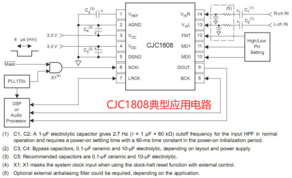 在3.3V供电、48kHz采样率下,CJC1808信噪比(S/N)与动态范围(DR)均可达101dB,总谐波失真加噪声(THD+N)低至-83dB;即使采样率提升至96kHz,信噪比与动态范围仍能保持99dB水平,THD+N低至-81dB,24位的分辨率确保了模拟信号向数字信号转换的精准度,还原清晰、细腻的音频细节;采样率支持8kHz至96kHz可调,系统时钟支持256fs、384fs、512fs三种模式。