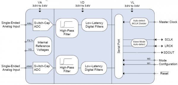 采用16引脚TSSOP封装,提供详细的典型连接图和PCB布局指南,商用级(-10°C 至 +70°C)与汽车级(-40°C 至 +85°C)两种温度规格,提供独立的模拟、数字与逻辑电源引脚,支持3.0V至3.6V宽电压输入,内置电源抑制比(PSRR)达50dB,有效抑制电源噪声。