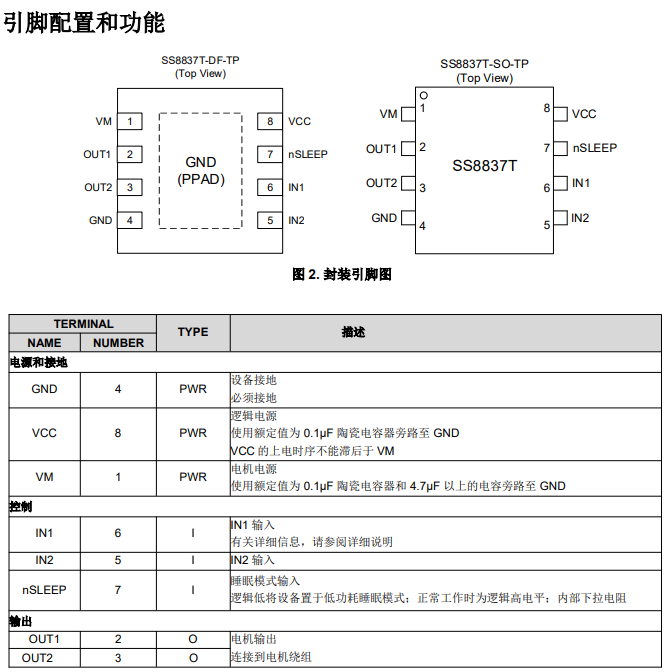 SS8837T是一款有刷直流电机H桥驱动器,同时可兼顾步进电机的驱动需求,可驱动一个直流电机或螺线管,内部采用N沟道功率MOSFET组成H桥电路,支持正向、反向、刹车和滑行四种电机控制模式,导通电阻(高侧+低侧)低至260mΩ,支持0至12V的电机电源电压(VM)和1.8V至12V的器件电源电压(VCC)可灵活匹配不同低电压供电场景。