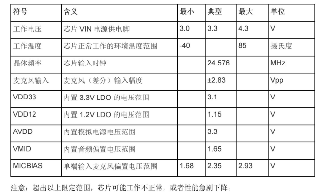 在音频品质方面,芯片支持高保真差分或单端麦克风输入,内置可调增益放大器,提供独立的I2S接口,便于连接高品质音频编解码器。音频性能指标:动态范围达 94dB,信噪比(SNR)超过 94dB,总谐波失真加噪声(THD+N)低于 -90dB,确保声音纯净、细节丰富。
