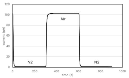O2-A2-GLF氧气传感器暴露于空气以及与N2交替接触时的快速响应曲线。