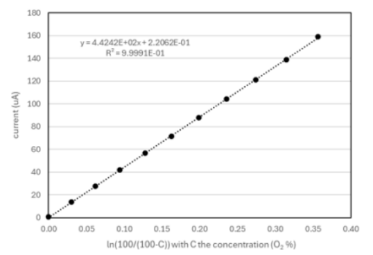 O2-A2-GLF氧气传感器氧气浓度在30%以内传感器输出信号呈线性。通过使用函数I =K*Ln(100/(100-C)可获得最佳拟合结果。