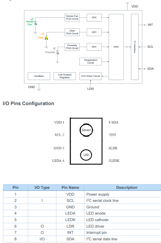 该器件采用I²C接口(快速模式,400kHz/s)支持2.4V至3.6V宽电压供电,工作温度范围覆盖-40°C至+85°C,满足工业级应用需求。支持ALS与PS的可编程中断功能,支持高低阈值设置,配合持久计数控制,避免频繁误触发;提供迟滞模式与区域模式两种工作方式,适应不同的接近检测逻辑,有效减少主控轮询负担。