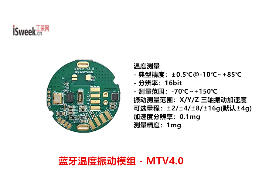 工采网代理的蓝牙温度振动模组 - MTV4.0基于无线蓝牙BLE5.1通信,采用敏源自主研发的高精度可编程数字温度系列芯片(T117B等),包含高精度三轴MEMS重力加速度和温度传感,可输出三维的加速度、温度信息,并嵌入式包含FFT频域分析,手机或其它蓝牙设备和模组进行通信,读取、显示测量数据,然后上传至云平台,可广泛应用于无线测温、可穿戴及冷链物流等领域。