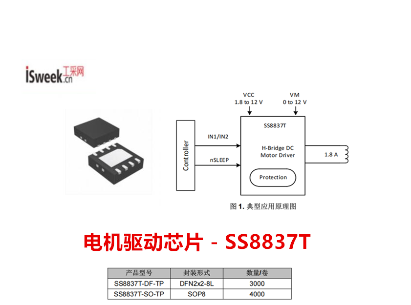 工采网代理的SS8837T是一款专为有刷直流电机开发H桥驱动器,同时可兼顾步进电机的驱动需求,可驱动一个直流电机或螺线管等,适用于工业自动化设备、一体化步进电机、按摩椅、智能家居等领域。以前方案很多采用TI的DRV8837或其他昂贵型号做直流电机驱动,随着中美贸易战以及产品价格平民化普及,很多大厂在做国产化替代设计方案;而国产SS883T可pin to pin兼容替代TI-DRV8837、拓尔微-TMI8230、禾润-HTD9202、艾为-AW8637、矽塔-SA8310。