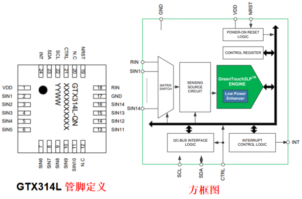 由工采网代理的GTX314L是韩国GreenChip推出的电容式触摸传感器芯片,支持最多14通道电容感应输入,采用I²C接口进行寄存器读写与控制,内置低功耗引擎(GreenTouch3LPM)支持1.8V至5.5V宽电压供电,提供QFN-24L封装,符合RoHS标准,通过CTRL引脚可灵活配置I²C设备地址,支持同一总线上多芯片并行工作,适用于电池供电设备及复杂电磁环境下的触控应用