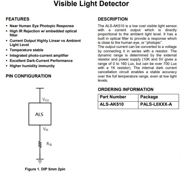 ALS-AK510工作电压范围:2.5V至13V,推荐5V,在10 Lux光照条件下,典型输出电流为12.8μA;在100 Lux和200 Lux时分别为129μA和254μA,其可用光照范围最高可达1000 Lux,在5V供电,10kΩ电阻下可实现0-160 Lux的测量范围,1kΩ电阻,则可扩展至700 Lux以上,适用于从昏暗夜灯到明亮背光等多种场景。