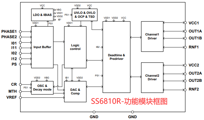 由工采网代理的SS6810R是一款双极低功耗电机驱动集成芯片,内部集成两个独立的H桥,可同时驱动两个直流电机或一个两相步进电机;采用PARA-IN驱动方式,通过PHASEx引脚控制电流方向,I0x/I1x引脚设置电流大小,无需复杂的SPI配置,适合对控制实时性要求较高的系统。