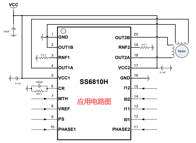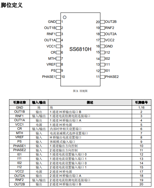 SS6810H每路最大可提供1.0A连续电流,工作电压范围宽达10V 至 32V,适配多种直流电机与步进电机应用,PARA-IN 驱动模式,具备灵活的电流调节机制,支持2bits 电流控制,提供100%、67%、33% 和 0%四个电流台阶,用户可通过外部引脚灵活配置输出电流,通过外接电流检测电阻与 VREF 参考电压,可精确设定斩波电流阈值,实现对电机运行状态的精细调控。