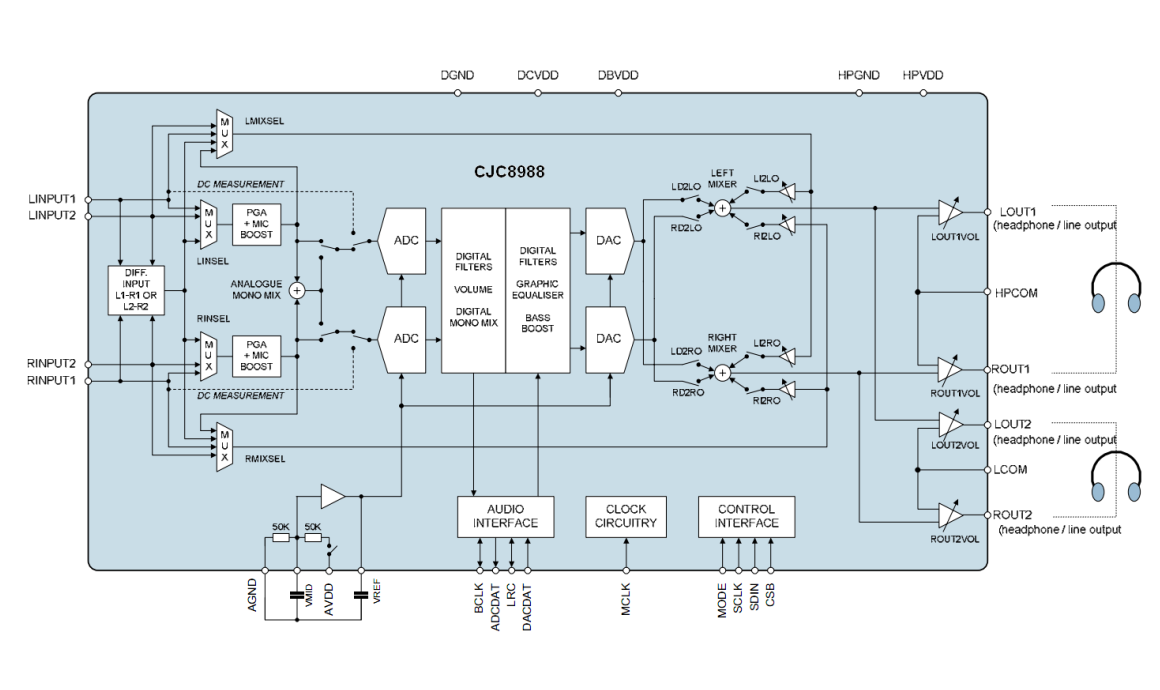 由工采网代理的CJC8988是一颗超低功耗的双路ADC和DAC的音频编码器芯片,有2个耳机放大器或立体声输入输出接口的AD/DA转换器。专门为低功耗、便携式设备设计开发的;具备静音功能和可编程音量调节。