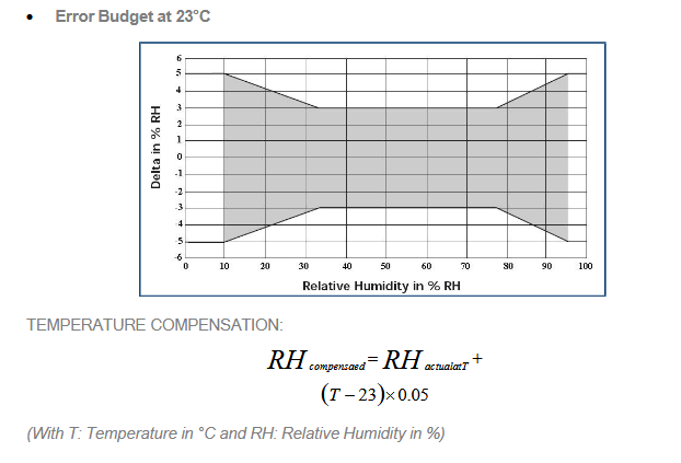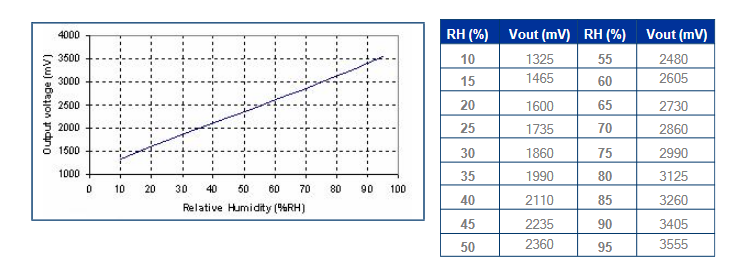 HW2200主要用于10 ~ 95%RH范围内的精确测量,此量程范围内测量精度高达±3%RH,超出此范围的环境并不会对传感器的可靠性产生影响。在高精度测量范围内,湿度与输出电压的线性关系非常优异,下图是实际测量的结果: